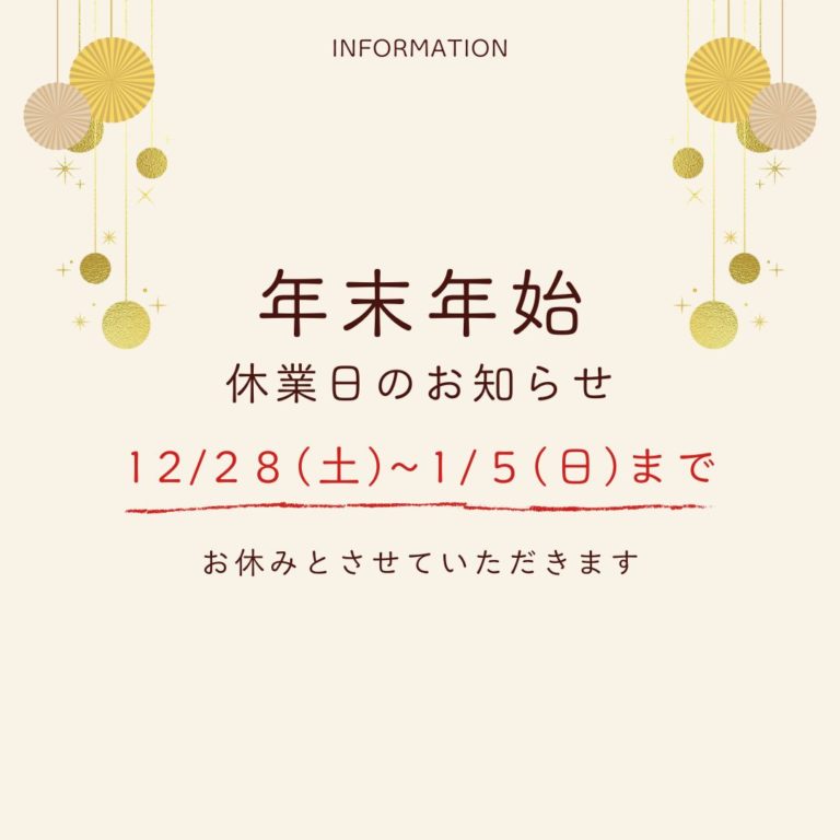 年末は12月28日(土)までの営業とさせていただきます。 年始は1月6日(月)より営業開始とさせてい -
